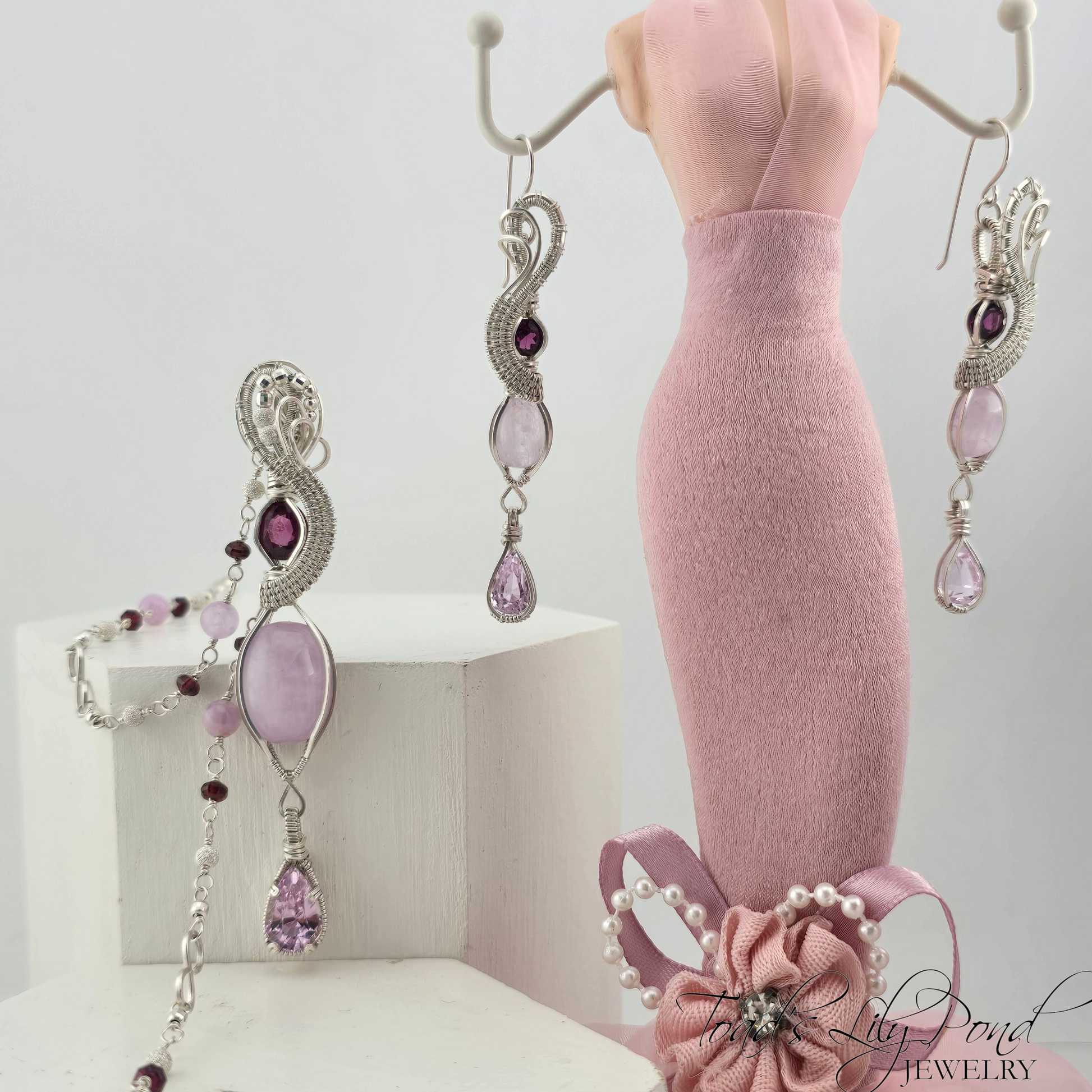 KG | $354.00 | $33.66 | $320.34 | 3.29" | 1.86ct Rhodolite Garnet (Mozambique), 4.11ct Kunzite (Afghanistan, pear cut), & 16.00ct Kunzite (oval cabochon) (PENDANT, EARRINGS, NECKLACE SET PRICE $800) | STERLING SILVER 92.5% | PENDANT |